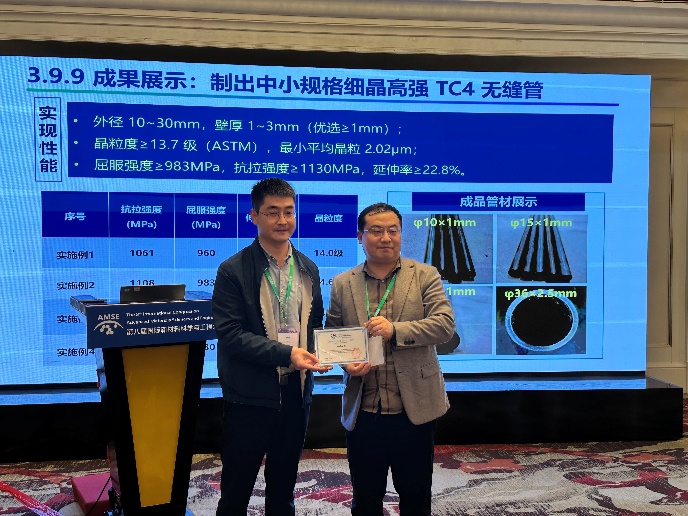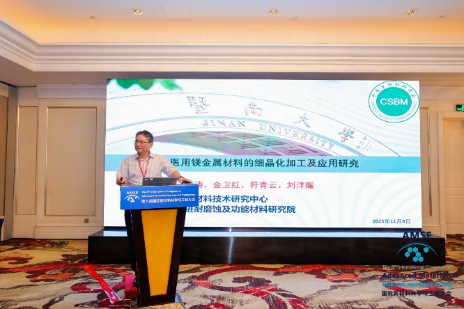 在先进金属和合金专题报告会上,于振涛教授担任主持人,并作题为“医用镁金属材料的细晶化加工及应用研究”的邀请报告,系统展示了团队在高纯镁加工工艺、系统性评价以及镁合金表面改性方面的最新成果,引发与会专家的广泛关注与深入讨论。刘洋赈副研究员汇报了“石墨-TiB₂混杂增强铜基复合材料的摩擦磨损行为研究”,重点探讨了石墨-TiB₂混杂结构对铜基复合材料摩擦机制的影响。金卫红副研究员的报告“可降解镁基骨修复材料表面功能涂层研究”展示了团队在实现可控降解与生物活性一体化涂层方面的关键突破。易艳良副研究员以“Fabrication and Strength-Toughness Regulation of High-Performance Small-to-Medium-Sized Thin-Walled Seamless Titanium Alloy Tubes”为题,介绍了团队在高性能薄壁无缝钛合金管的制备工艺及强韧性协同调控方面的研究进展。曹晟副研究员的报告“Heterogeneous and Gradient Microstructure Prepared by Additive Manufacturing”展示了通过增材制造技术实现的异质梯度微结构及其性能特点。