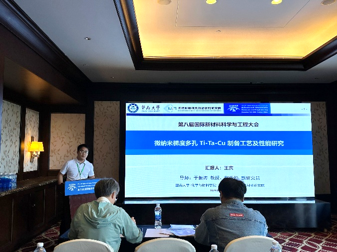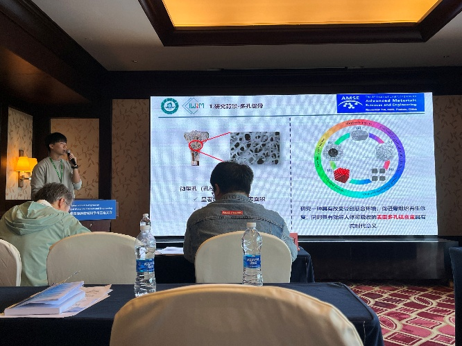 参会硕士研究生也进行了口头汇报,何建斌作题为“一种表面多级孔结构镁合金材料及其制备方法与应用”的报告,王宾作题为“微纳米梯度多孔Ti-Ta-Cu制备工艺及性能研究”的报告。