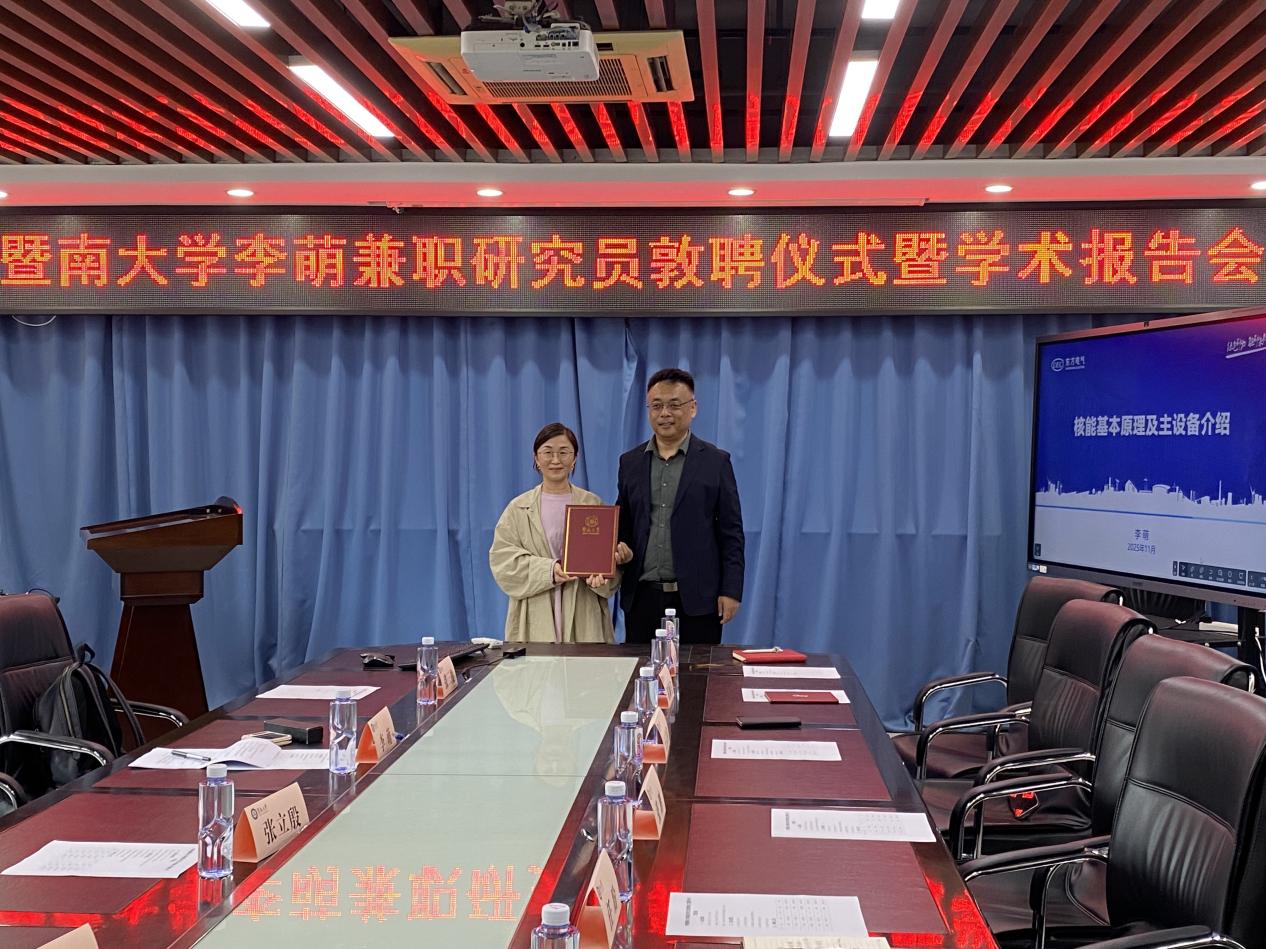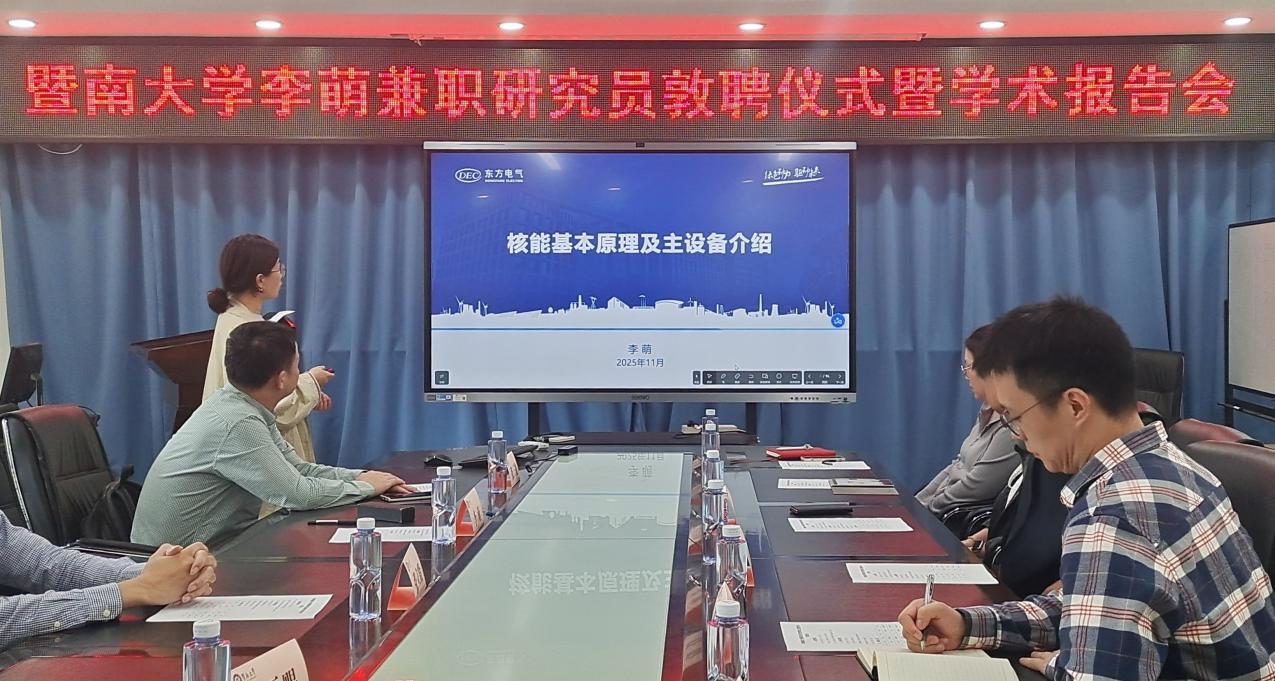 11月14日下午,暨南大学李萌兼职研究员敦聘仪式暨学术报告会在第二理工楼347会议室顺利举行。活动由化学与材料学院副院长、先进耐磨蚀及功能材料研究院院长王启伟研究员全程主持,东方电气(广州)重型机器有限公司副总工程师李萌携企业团队受邀参会,研究院师生及科研人员共同参与。本次活动以“人才引育”与“学术交流”为核心,为校企深度合作搭建了坚实桥梁,助力核电材料与装备技术创新及学科人才培养提质增效。